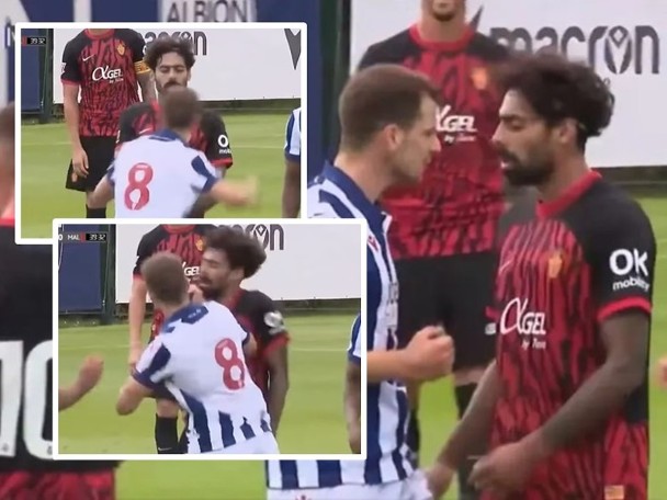 周六(27日)晚季前热身赛,冠军联赛球队西布朗对阵西甲马略卡,同场加映「拳击赛」,莫林比和森美哥斯达先是吵架,然后动武,挥拳互打,像足打拳击赛。