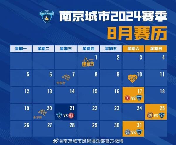 南京的士兵们将在8月份迎来中国甲级联赛和足总杯的双重考验。经过三周的准备期,我们将在8月17日客场挑战辽宁铁人;周中,球队将回到主场,在足总杯八强对阵成都成都;然后周末回到东北平原,在哈尔滨对阵黑龙江冰城;8月31日,球队将访问佛山面对佛山南狮。八月是追寻梦想的时刻,我们不会停下前进的步伐,将继续努力训练、认真备战。希望广大球迷朋友们能在八月与我们携手,创造更多精彩时刻!