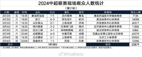 2024中超联赛现场观众人数统计(第21轮)