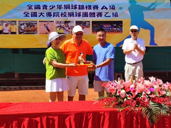 台中市网球委员胡登富主委员会向筑波科技许深福董事长赠送日本仕女纪念品。