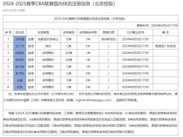 8月6日消息,CBA官方网站今天发布了2024-2025赛季北控男篮的国内球员注册情况。