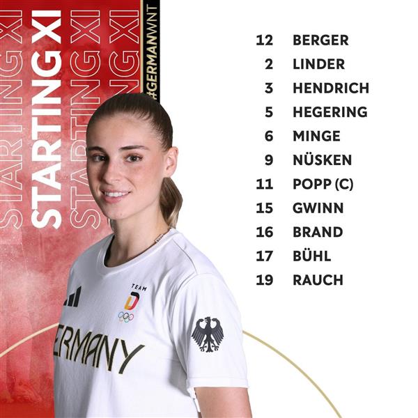 德国女足首发:12-安-卡特琳-伯格、2-林德、3-卡特琳-亨德里希、6-珍妮娜-明格、9-努斯肯、11-亚历山德拉-波普、15-格温、16-朱莉-布兰德、17-克拉拉-布尔、19-劳赫