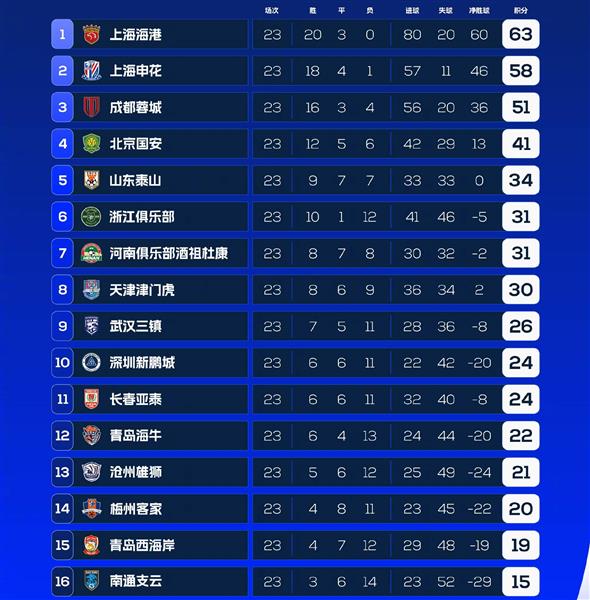 天津津门虎重返胜利轨道,30分排名第八。2022年,曾经获得中超冠军的土豪武汉三镇,客场0-2不敌谢晖执教的长春亚泰,26分继续排名第九。