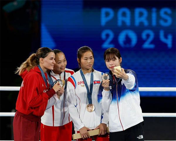 在巴黎奥运会女子54公斤级拳击颁奖仪式上,韩朝选手并列第三。韩国选手林爱吉原本想要拥抱朝鲜的朋友方哲美,但对方却没有回应,毕竟她也有自己的考虑。因此,虽然彼此心中互相尊重,这对对手之间仍然留下了一丝遗憾。