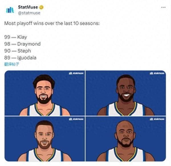在过去10个赛季的NBA季后赛中,胜场数最多的四名球员均是现役或曾效力于勇士队的球员。