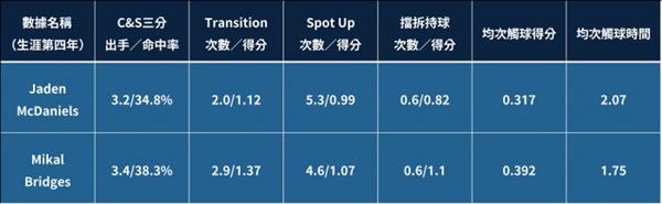 如今,Jaden McDaniels平均年薪2,620万的五年大约即将开始,它的薪酬空间和角色定位,以及Mikals,曾经和凤凰城太阳一起进入总决赛。 Bridges续签的4年9000万合同其实很接近。但是,当后者成为一个接应的3D侧翼,可以稳定地为进攻和防守做出贡献时,前者在体育场的两端仍然有不稳定的增长空间,值得讨论。也许通过对比同期的两人和J-Mac本季的表现,我们可以更清楚地了解这位6英尺9英寸的瘦高前锋有哪些技能需要进步。