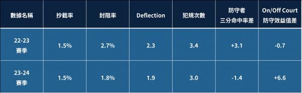 与Bridges简单无华的简单干扰类型防守相比,防守方面,J-对于王牌来说,Mac的防守显然更加凶猛,也因此很容易失去很多犯规。但从数据方面来看,J-虽然Mac的高侵略性可以对对手的命中率产生显著的影响,但在封堵和复制方面还是很难称得上擅长。双塔阵型的广泛应用也使得J-Mac的防守任务能够更加专注于封锁对手持球者的外围锁定位置,从偶尔需要客串护框的防守者,进而逐渐降低封阻率。