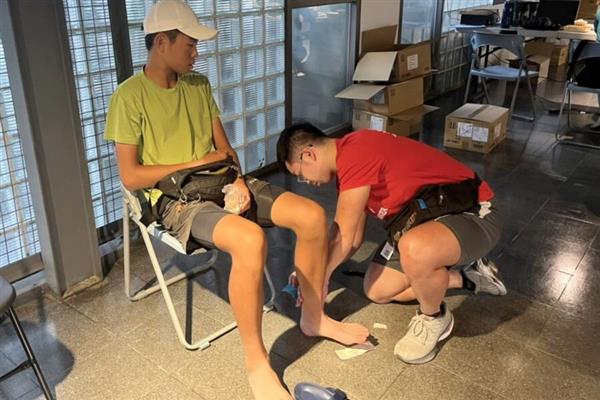 会议保护员在赛前为球员贴上贴纸。