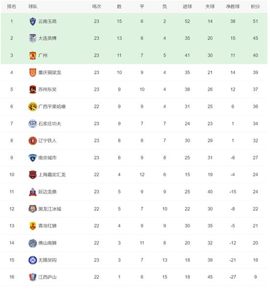 双方最终打成平局,广州队主场拿到1分,总分提高到40分。虽然大连英博在这一轮取得了胜利,但广州队本身也取得了胜利,错过了追赶对手的机会。目前还是落后对手5分。苏州东吴连续6轮不败,总分提高到37分,暂时排名第五,依然落后第二名8分。