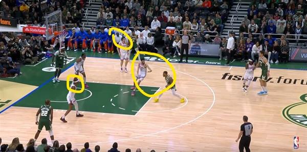 Figure 2. 雷霆防守位置,球员在强侧堆积,注意他们的位置,在禁区和三分线之间,这样如果对手传到弱侧底角,就很容易被抄断,这个位置也可以快速防守和轮回。