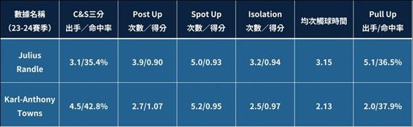 相比之下,Randle习惯于从中距离发起,接应三分投篮多,但命中率不是很好,无论是低位还是面框单打效率都低于KAT,先发可能会卡住进攻空间。