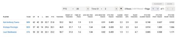 从数据上看,职业生涯场均4.3次三分球和39.8%的命中率注定了KAT作为无球副手的高位。此外,KAT是去年每回合持有时间不到2秒的球星之一,其中三位得分可以超过20分。能够同时兼顾产量和效率的延伸型老人,仍然是这个大三时代的稀有财富。