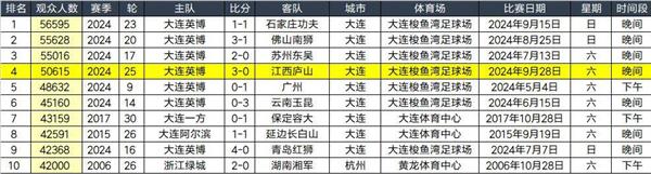 本场比赛面对江西庐山,50615名观众在大连梭鱼湾足球场观看比赛。这个数字超过了之前大连英博对阵广州的48632人,在中国甲级历史上排名第四,也是中国甲级历史上第四场观众超过5万的比赛。在这份榜单中,大连英博已经占据了前六名,第七名和第八名由大连人创造,第九名也是大连英博,第十名由2006年浙江绿城主场创造。从本赛季的中国甲级赛程来看,大连英博的下一场主场比赛很可能会继续有5万多名观众。