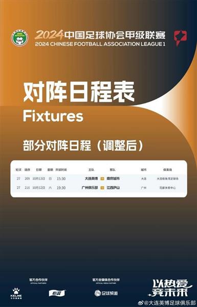 为了方便球迷观看比赛,联赛组织者经大连赛区和大连英博足球俱乐部申请,协商相关俱乐部,决定调整2024年中国甲级联赛第27轮大连英博主场比赛的日期。