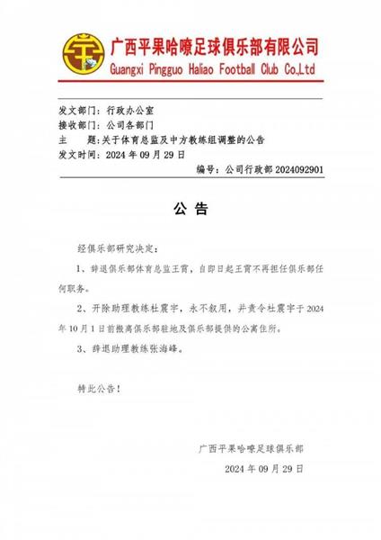 九月三十日,广西平果哈嘹俱乐部昨日宣布解雇体育总监王霄、助理教练张海峰,解雇助理教练杜震宇。根据《足球报》的报道,这一事件引起了平果市和自治区的高度重视,市里也介入了对这一事件的了解和调查。
