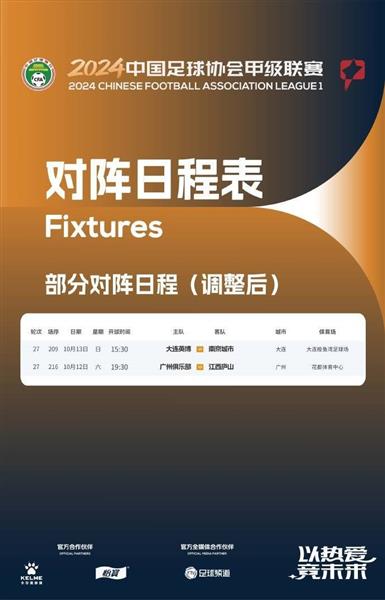 根据计划,大连英博将在10月12日(星期六)15:30举行中甲第27轮对阵南京城市的比赛,而广州队将于10月13日(星期日)19:30迎战江西庐山。
