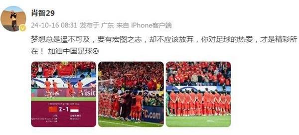 10月16日,国足主场2-1击败印尼,获得18强首胜。赛后,前国际球员肖智在社会媒体上发布消息,鼓励中国足球继续追求自己的梦想。