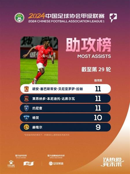 10月27日讯,随着中甲联赛第29轮的结束,官方更新了助攻榜。目前,贝尼亚罗萨、莱昂纳多和约尼查的助攻数均为11个,三人的竞争需要等到最后一轮才能揭晓。