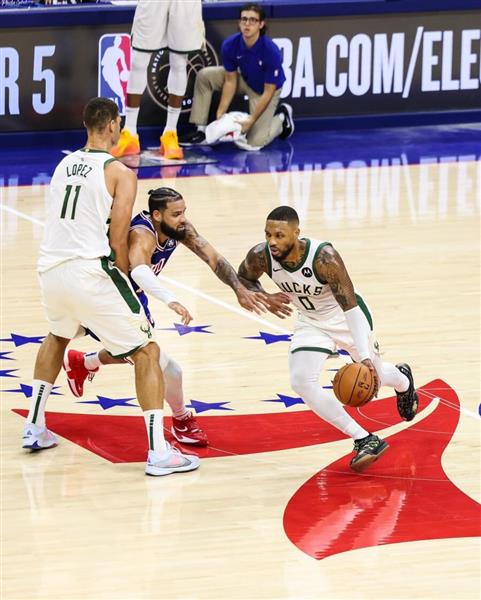 公鹿队在第一场比赛中发挥了新的花样,主要围绕着Lillard「无球掩护」以长人为核心,同时让长人站在高位发牌主导进攻,以及Lillard和长人「短」挡拆配合。