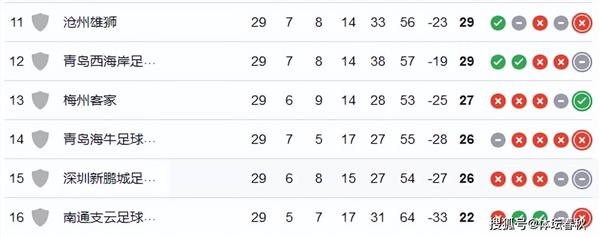 此外,值得一提的是,如果海牛队在主场击败沧州狮子队,深圳新鹏城队也在主场获胜,那么海牛队、深圳新鹏城队和沧州狮子队将获得29分。球队之间的相互记录和净胜球将成为决定降级的关键因素。