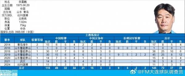 除了中超,李霄鹏还带领青岛中能、山东鲁能和武汉参加了足协杯,还带领鲁能参加了亚冠。在他参加的正式比赛中,他带领的俱乐部球队总共取得了72胜37平39负。