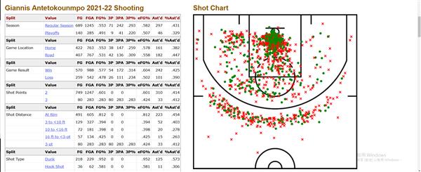 上面的图片是字母哥在21-22赛季的出手比例。