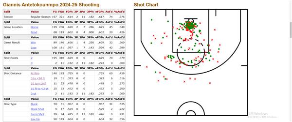 上图为字母哥在24-25赛季的出手比例。