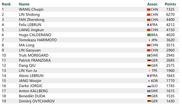 樊振东近期连续退赛,本周更新后仅剩3个有效比赛场次,扣除350分后总分为4050分。张本智和获得总决赛亚军,拿到1050分,排行总分上升至4405分。此外,小勒布伦、梁靖崑和卡尔德拉诺在总决赛中的表现不佳,均在首轮被淘汰,整体总分保持不变。