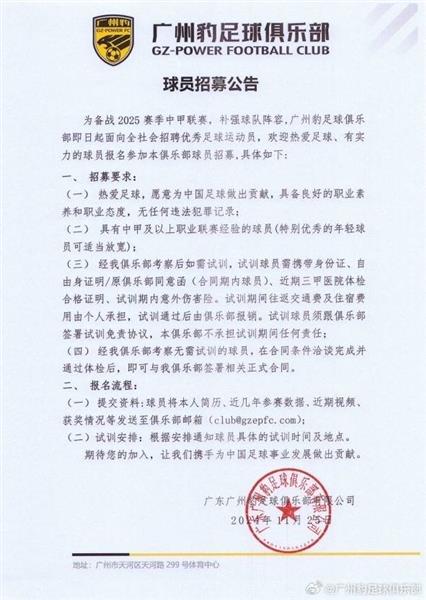 11月25日,广东广州豹足球俱乐部发布了球员招募公告。为了准备2025赛季的中甲联赛,增强球队实力,俱乐部现面向社会招聘优秀的足球运动员。