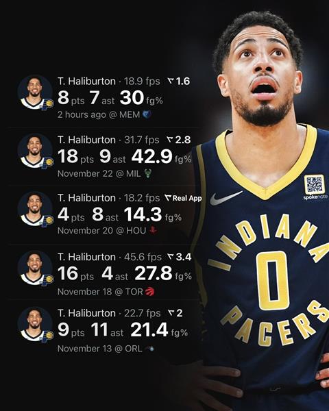 9胜14败的战绩,胜率不到50%,在实力较弱的东区排名第10的附加赛边缘,而如果在西区,则是最后一个座位的倒数第四。是什么让上赛季还在东区冠军赛中与塞尔蒂克争夺冠军,但在阵容没有太大变化的情况下,电梯一路向下,阵中的领头羊Tyrese? Haliburton(哈利波特,以下简称哈利)难辞其咎。