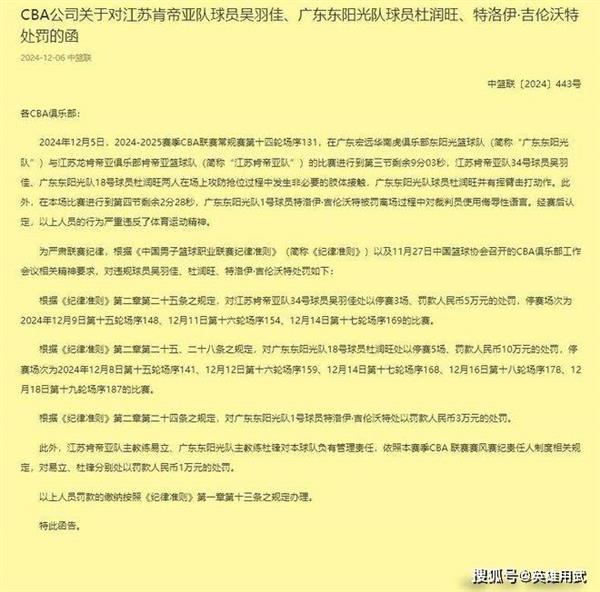 许多球员和教练,如杜润旺、吉伦沃特、杜锋和吴羽佳,都受到了不同程度的惩罚。