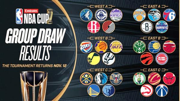 根据2023-24例行比赛的记录,小组赛将首先按照特定的规则对全联盟30支球队进行分类,然后随机分配到6个小组,每组5支球队。