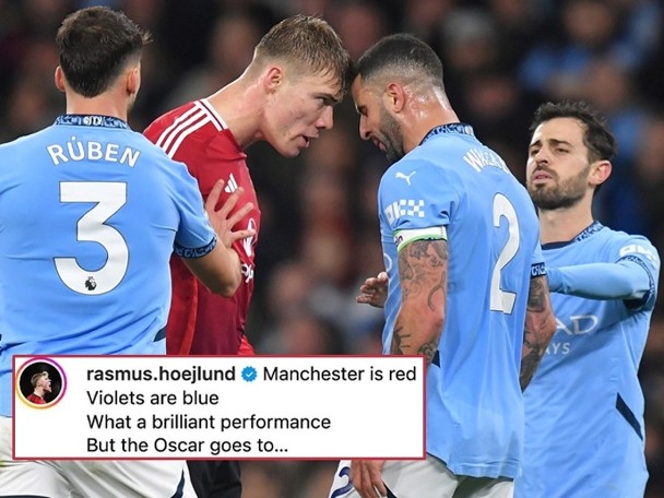 英超「曼市打吡」充满了火药味。曼城上半场领先后,基尔获加粗暴地踢了曼联前锋海伦一脚。海伦立刻跳起来,冲向对方破口大骂,额头一度顶向基尔获加的头。基尔获加立即「影帝」上半身,假装被头撞后痛苦地倒在地上,引起双方球员的推撞,但VAR覆核后证实了暴力行为,最后两人各拿一张黄牌。