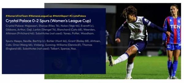 12月12日——英格兰女足联赛杯小组赛第三轮,王爽本赛季首次代表托特纳姆。