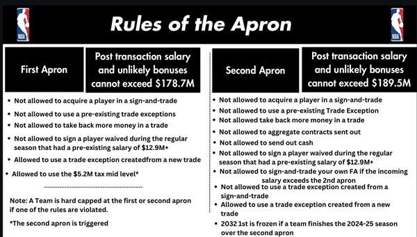 第二层围裙于今年夏天开始实施。 (the second apron) 让过去没有预算上限的球队,比如快艇,面临失去mid的情况。-levelexception, 不能合并球员合同的交易限制,不能先签后换,甚至失去选秀签等惩罚。除了让新太阳老板在生效前完成Bradley之外,这项规定的公布除了Beal交易,今年夏天只有Klay。两个所谓的Thompson和KAT。 block buster trades. 今天NBA各有6支球队在第一和第二层围裙中;基本上,近40%的球队在签约交易中受到围裙的限制。