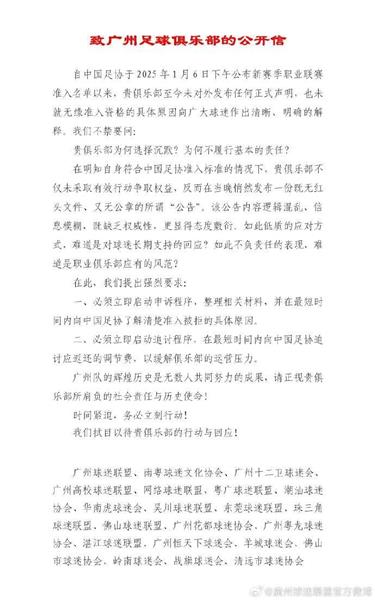 北京时间1月7日,中国足协昨日公布了2025赛季职业联赛准入名单。中国A的广州队没有列出来,然后广州队宣布解散。对此,21家广州球迷协会发布联合公开信,要求俱乐部解释并投诉。