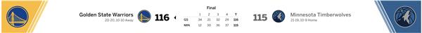 进入第四节,狼的外线感觉可以说是完全觉醒了。单节12投7中的三分球瞬间将差距缩小到一个球权,而勇士终于迎来了Buddy。 Hield的手感恢复,虽然曾经在最后一分钟被狼追平,但是Curry随后靠着底角的三分球超越,罚球终于在关键时刻起作用,最终成功地赢得了下赛季的第20场胜利。