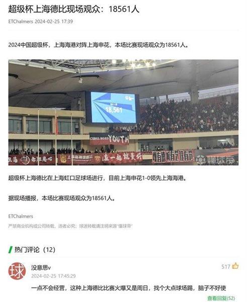 2024年2月举行的超级杯,在虹口足球场举行了港口与申花的强烈对话。只是因为380元、580元、880元的票价太高,上海球迷最终还是用脚选择了——票价太贵,超出了球迷的心理预期和承受能力,最终能容纳近3万人的虹口,上座率只有18561人,现场气氛并不热烈。