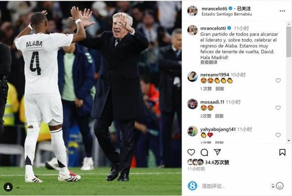 安切洛蒂社媒与阿拉巴拍了一张照片,并写道:“每个人都打了一场精彩的比赛,帮助球队登顶。最重要的是庆祝阿拉巴的回归。我们很高兴你能回来,大卫。Hala Madrid!”