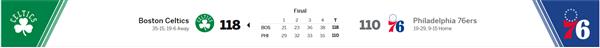 当主队无法获得有效的进攻效率时,Tatum、Jaylen Brown和Luke Kornet继续在伤口上撒盐,保持一点领先,进入最后两分钟;虽然七六个人想停止犯规得分,但四投只有一中给了对手一个离开的机会,然后Jrue 在最后一节38之后,Holiday的外线破网后将结局底定。:在16波反击之后,塞尔提克118:110赢得了本赛季客场第20场胜利。不可思议的是,22投14中的三分量能量可以在下半场以三分线的几个步骤命中。此外,20次助攻的突破和三星的54分合攻给费城带来了令人震惊的教育。