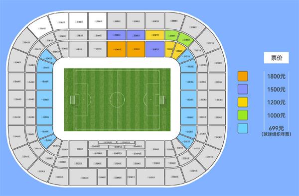 再次看一下单场票价,分别是300元的VIP座位,一楼的B4。、B5、B6和二楼的B5有四个区域,180元。票价150元的区域有九个,基本都是一楼和二楼的正面看台。接下来的票价依次是120元、100元、60元。值得一提的是,60元的看台很多。与去年40元的票价相比,只提高了20元,可以说非常贴近百姓。与其他专业足球场球队相比,这个单场票价与24赛季专业足球场中票价最低的青岛海牛相似。价格是58元、98元、188元、360元,票价甚至比一些使用非专业球场的球队还要低。