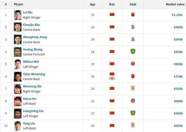 中国球员身价排名前十(单位:欧元):