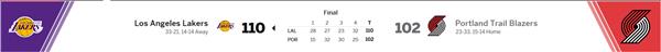 然而,即将回归灵魂的湖人队,依然可以在拉锯的时刻展现自己的经验,LBJ主导攻势与Dorian Finney-Smith,配合成功的禁区缩防和篮板巩固,强迫开拓者放慢速度,推动追分节奏。虽然Reaves的命中率不好,但是防守端出色的1抄截2阻攻表现直接封锁了对手的两个得分点,关闭了主队逆转的最后希望。在双持球员72分的强势领导下,湖人以110结束。:102击败拓荒者拒绝连败。