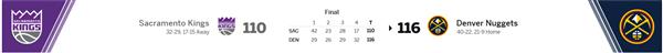 现在努力在季后赛冲刺的国王昨天来到丹佛高原挑战金块。前两场比赛都没赢,自然更渴望这场胜利。虽然开场双方的比分互相拉锯,但后续客队表现出了进攻的把握,年轻球员Jakee LaRavia如雨后春笋般涌现,冲进3个外线并攻入11分,助队将领先两位数;被内线包围的主队,虽然在禁区内还是可以拿下分数的,但是外线感觉不好很难跟上对手。12分钟过去了,29分钟。:42失去优势。