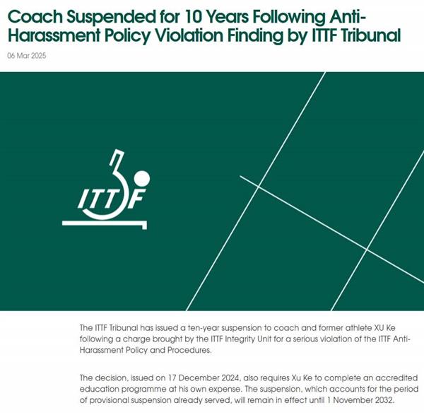 国际乒联在官方公告中写道:国际乒联诚信部门指责教练兼前运动员XU KE严重违反了国际乒乓球联盟的反骚扰政策和程序,国际乒乓球联盟对此处以10年禁赛处罚。该决定于2024年12月17日发布,并要求XU KE自费完成认证教育计划。在2032年11月1日之前,暂停计算已完成的临时暂停期将有效。
