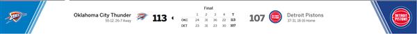 下半场易篮之后,SGA就像一台无法解决的抢分机。所有的5投都击中了,罚球线也没有失败。获得17分成为雷霆拉开对手的关键。活塞虽然保持了很多人的得分记录,但是零星火力跟不上西区的领导。五个错误让它付出了代价,甚至一度落后到14分。最后一分钟,情况变得更糟了。从Stewart的无持球犯规开始,Cunningham和Dennis Schroder争论双双领取技术犯规,前者被驱逐,基本上注定难以再次逆转局面。