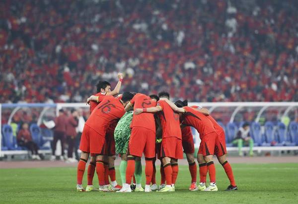 三月二十五日,2026年美加墨世界杯亚洲区预选赛18强C组第八轮比赛开始前,中国队球员加油。