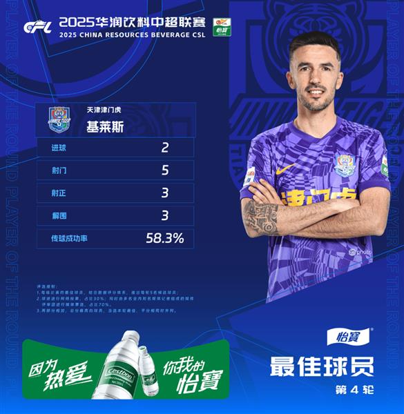 在2025华润饮料中超联赛第4轮比赛中,主场作战的天津津门虎2比2战平北京国安。在天津津门虎0比1落后的情况下,第71分钟,基莱斯接到谢维军的头球摆渡,近距离左脚劲射破门,帮助球队扳平比分;第78分钟,哈达斯右路传中,基莱斯抢射破门,上演梅开二度。
