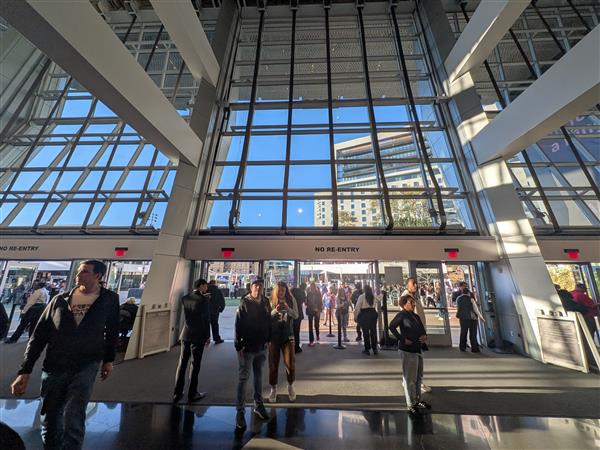 Golden 1 Center 入口有五个大型可折叠玻璃门,受飞机机库门的启发。这些门可以向上折叠,打开后可以将室内外广场连接起来,营造出无缝的室内外体验。