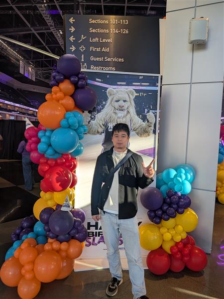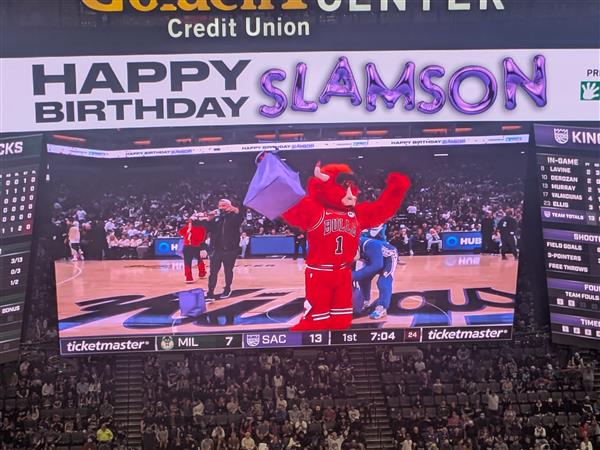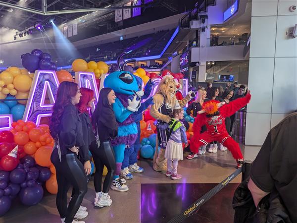 一进去,马上就看见了各队吉祥物,原来今天是Kings的吉祥物Slamson的生日派对。他的好朋友来自世界各地帮助他庆祝生日。